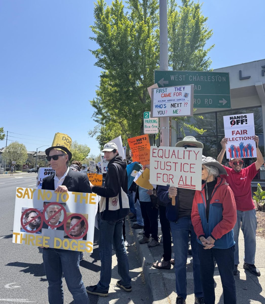 ![A protester in a chicken suit wearing a taco hat with the words “Cluck Trump” at the “No Kings” Democracy Fair in Palo Alto on Saturday. Protestor Mary Chan said she and her husband are horrified at the state of science and medicine in America. “What he [Trump] is doing by defunding scientific research is destroying our academic medical centers, and he’s [Trump] bankrupting rural medical centers,” Chan said. “We will have lasting negative impacts on American health for decades.”](https://palyvoice.com/wp-content/uploads/2025/10/11562FFE-9912-4152-BB01-582426B52ECB_1_105_c-225x300.jpeg)