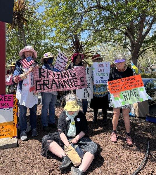 Waving bold, handmade signs and cheering at cars passing by, Palo Alto community members gathered to “Protest Elon Musk’s Illegal Government Takeover,” at noon, yesterday in front of the Tesla showroom along El Camino Real.