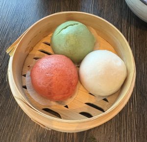 The colorful dessert featured a trio of three visually appealing baos: a white bao with a salted egg yolk in the center, a bright pink taro paste bao and a green tea bao with coconut filling. Warm and pillowy, the bao buns had a soft texture and were easy to bite into. The pastes inside the baos each had a distinctive flavor true to their name, though the green tea coconut had a considerably noticeable artificial taste. The distinctive sweet flavors of the buns make them an intriguing dish. However, a better pairing than green tea and coconut together would have further elevated the dessert.